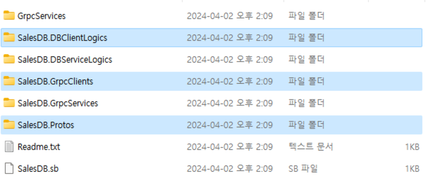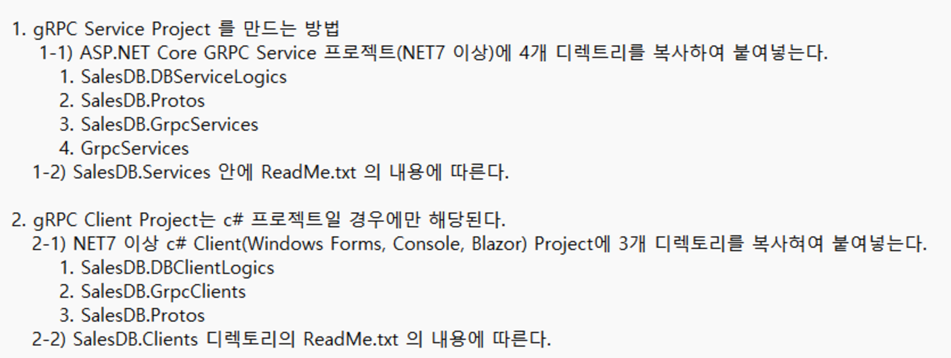 Service가 포함된 디렉토리와 Protos 디렉토리를 [복사]하여 서버 프로젝트에 [붙여넣기]를 한 후에 GrpcBizServices 디렉토리에 Readme.txt 내용을 따라서 코드를 수정한 후에 프로젝트를 컴파일하면 gRPC 서비스 프로젝트를 완성할 수 있습니다.