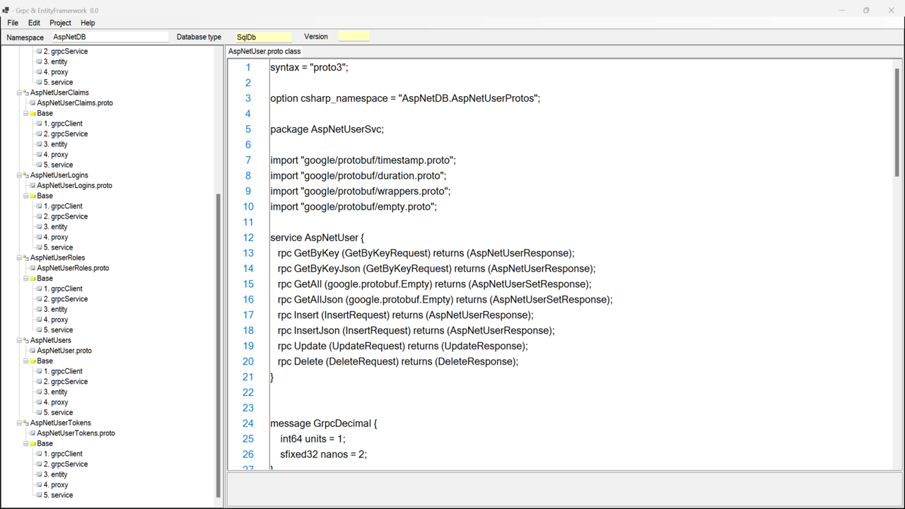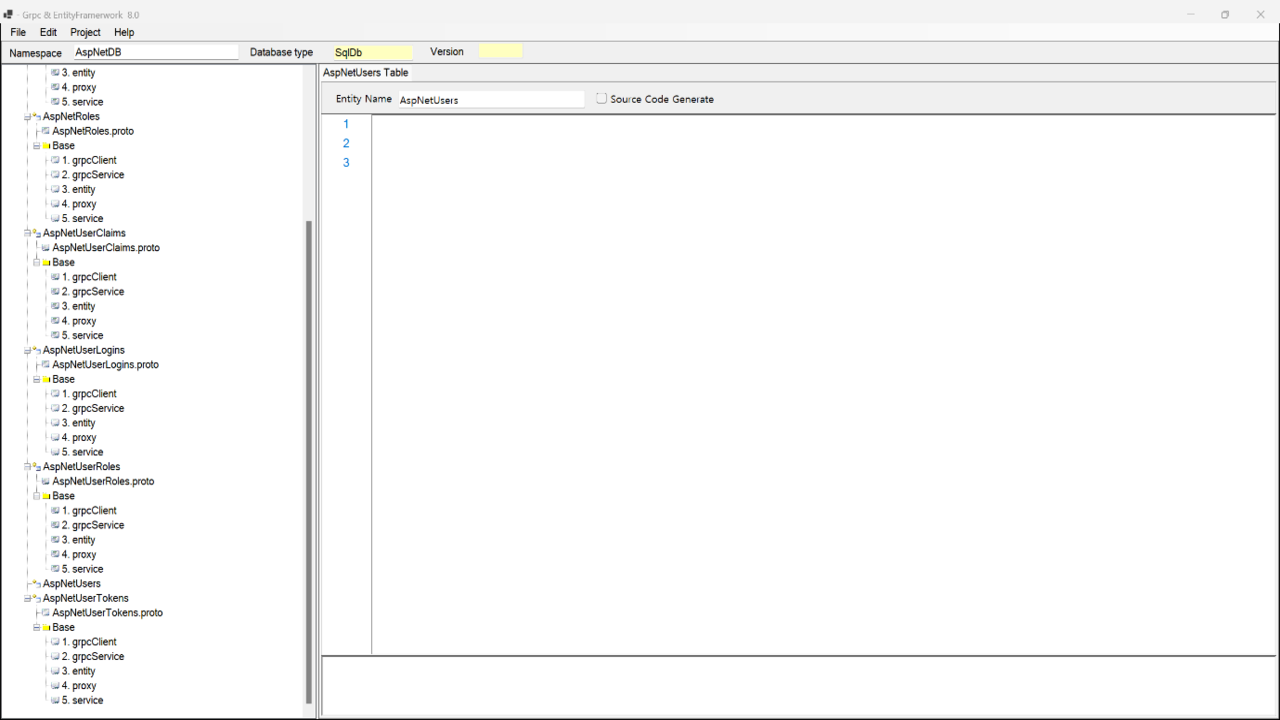 왼쪽창에 AspNetUsers Table Node를 클릭하면 오른쪽창에 Entity Name TextBox에 AspNetUsers라는 테이블 이름이 나타납니다. 이 테이블에 대한 gRPC 서비스 CRUD 코드를 생성하려면 [Source Code Generate]의 체크박스를 클릭하면 선택된 Table에 대한 gRPC 통신코드가 만들어집니다.