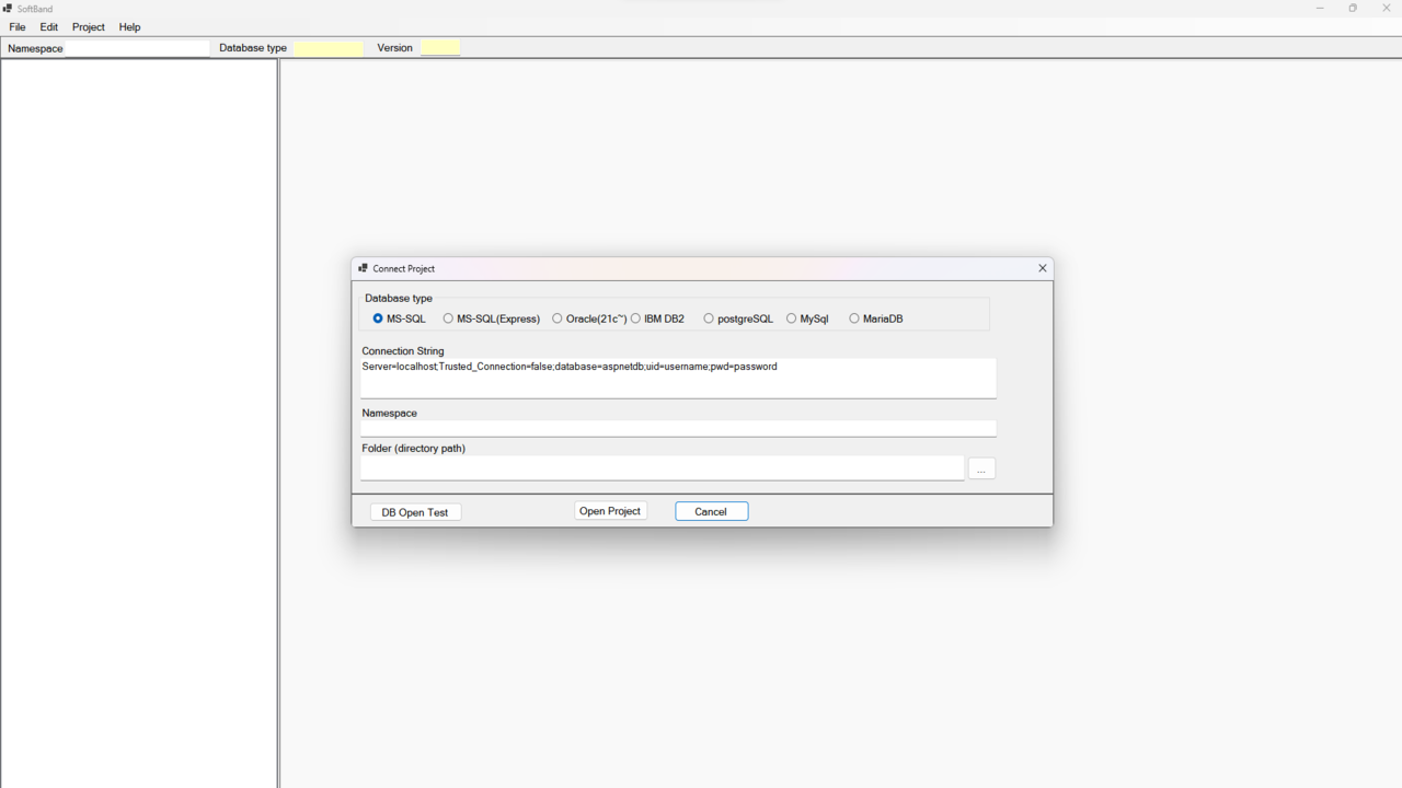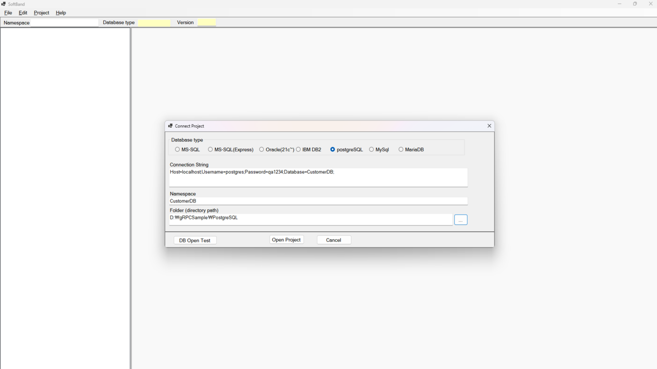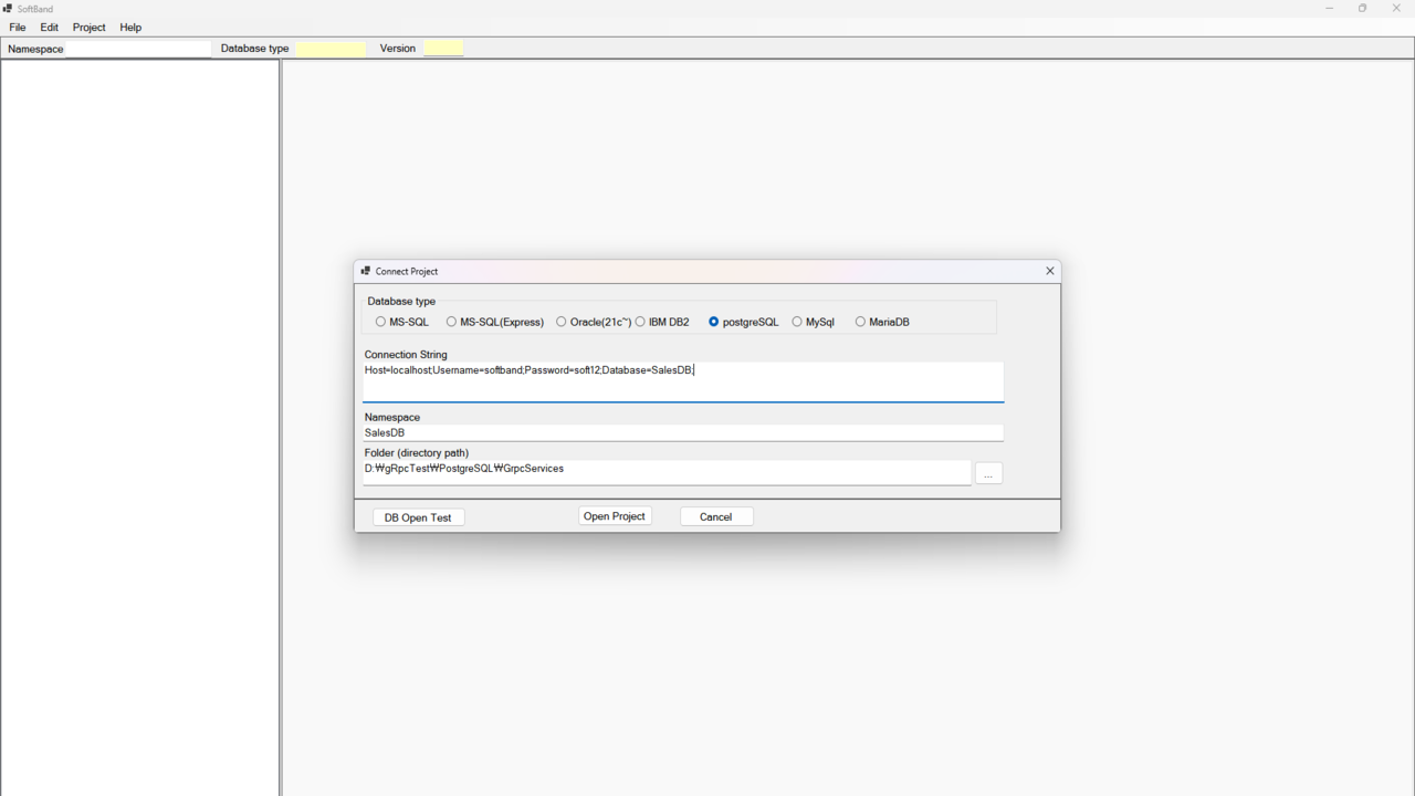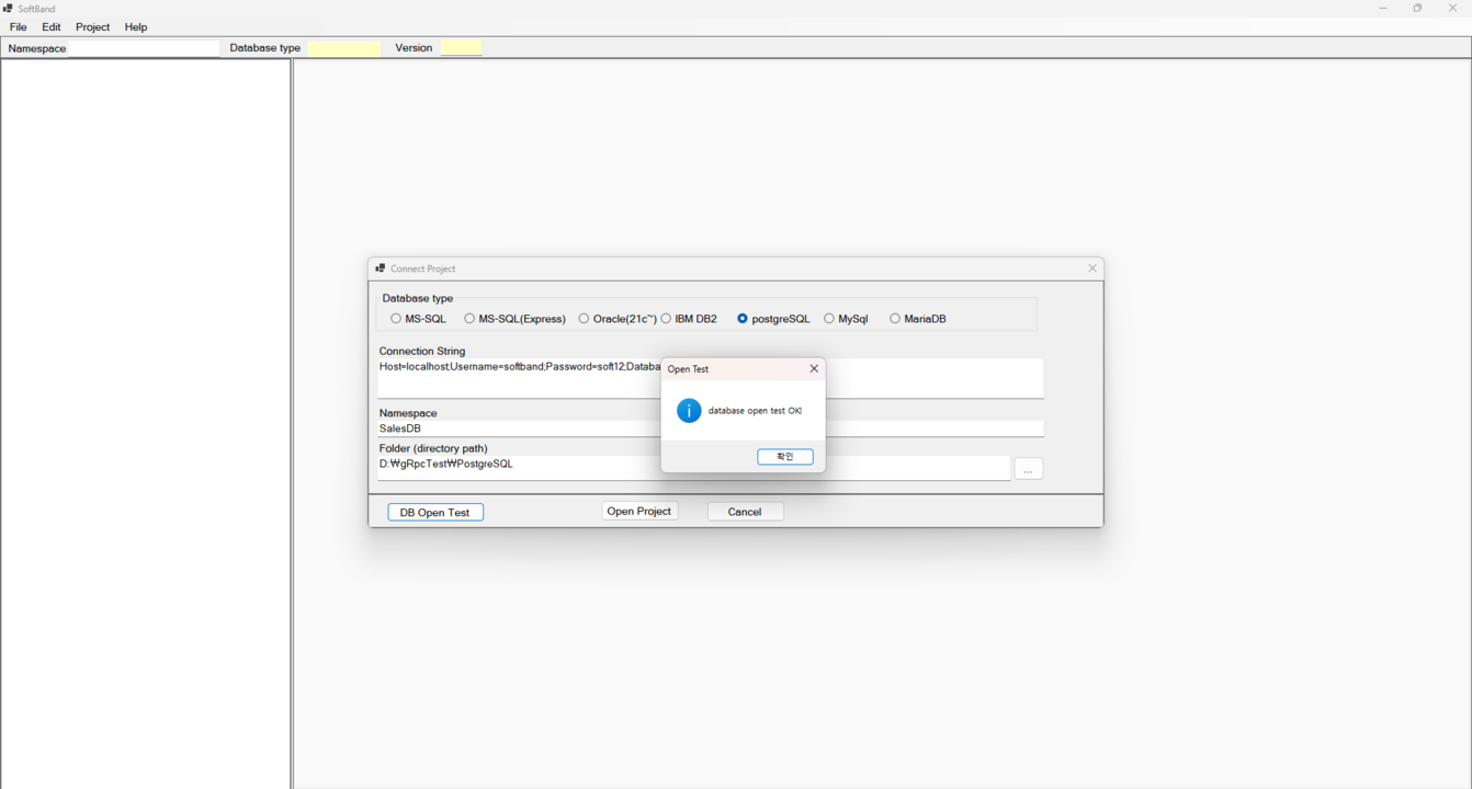 Open Project: 데이터베이스 연결이 확인되면 [Open Project] 버튼을 클릭하여 SoftBand Tool 내에서 프로젝트를 엽니다.