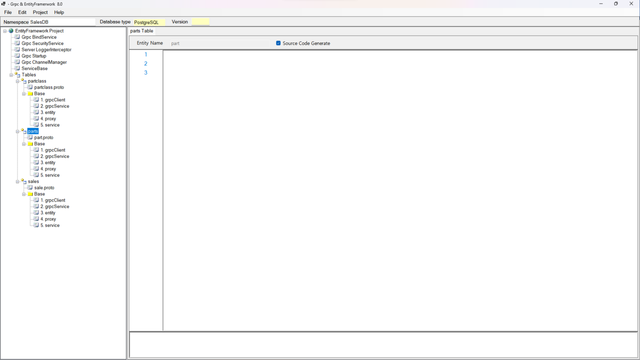 Tables의 하위 노드를 클릭하면 오른쪽 화면에 Entity Name을 수정하고 Generate할 수 있습니다. Generate하면 왼쪽 노드에 Entity Name의 proto파일과 5개의 Base파일이 생성됩니다. Entity Name은 proto파일의 namespace 및 Service명을 생성할 때 적용됩니다.