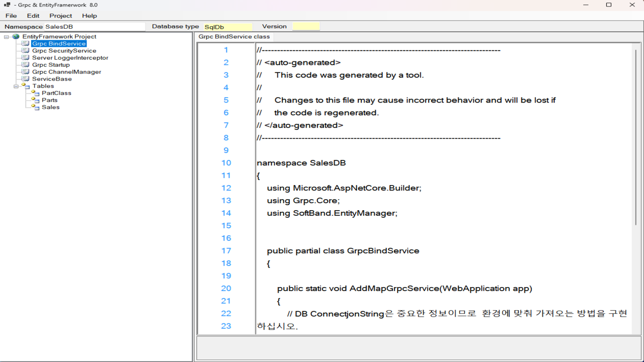 DataBase정보를 사용하여 gRPC를 만드는 것은 DB EntityFrameWork와 비슷합니다. DB에 접근하는 CRUD를 gRPC 호출로 이루어지도록 만들어집니다.